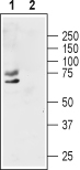 Western blot analysis of human MCF-7 breast adenocarcinoma cell lysate:1.Anti-KV1.1 (extracellular) antibody ( AMM06215G), (1:200).2. Anti-KV1.1 (extracellular) antibody, preincubated with the control peptide antigen.