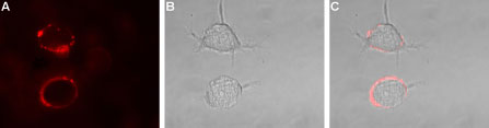 Expression of KV1.1 in rat PC12 cells Immunocytochemical staining of live intact rat PC12 pheochromocytoma cells. A. Extracellular staining of cells with Anti-KV1.1 (extracellular) antibody ( AMM06215G), (1:50), followed by goat anti-rabbit-AlexaFluor-594 secondary antibody (red). B. Live view of the cells. C. Merge of A and B. |