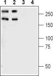 Western blot analysis of rat (lanes 1 and 3) and mouse brain synaptosomal fraction (lanes 2 and 4):1, 2. Anti-Plexin-A1 (extracellular) antibody ( APR12897G), (1:400).3, 4. Anti-Plexin-A1 (extracellular) antibody, preincubated with the control peptide antigen.