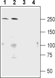 Western blot analysis of mouse brain lysate (lanes 1 and 3) and rat brain lysate (lanes 2 and 4):1,2.Anti-Shank1antibody ( APR13275G), (1:400).3,4. Anti- Shank1 antibody, preincubated with the control peptide antigen. |