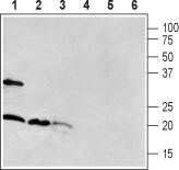 Western blot analysis of rat brain (lanes 1 and 4), mouse brain (lanes 2 and 5) and rat pancreas (lanes 3 and 6):1-3.Anti-RAMP1 (extracellular) antibody ( APR13064G).4-6. Anti-RAMP1 (extracellular) antibody, preincubated with the control peptide antigen. The Antibody was used at a concentration of 1:400 for brain lysates and 1:200 for pancreas lysates.