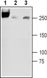 Western blot analysis of rat new born brain lysates (lanes 1 and 3), rat adult brain membranes (lane 2):1, 2. Anti-Nav1.3 (extracellular) antibody ( AMM06562G), (1:200).3. Anti-Nav1.3 (extracellular) antibody preincubated with the control peptide antigen.