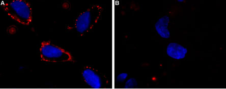 Expression of Nav1.3 in HEK-293 transfected cells Immunocytochemical staining of intact living HEK-293 cells expressing rat NaV1.3. A. Extracellular staining of cells using Anti-NaV1.3 (extracellular) antibody ( AMM06562G), (red). B. Cells transfected with the empty vector show no NaV1.3 staining. Nuclear staining using DAPI as the counterstain (blue). |