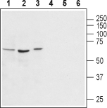 Western blot analysis of rat kidney (lanes 1 and 4), rat pancreas (lanes 2 and 5) and mouse heart (lanes 3 and 6):1-3.Anti-Vasopressin V1AReceptor antibody ( APR13941G), (1:400).4-6. Anti-Vasopressin V1A Receptor antibody, preincubated with the control peptide antigen.