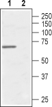 Western blot analysis of human Burkitts lymphoma (Daudi) cell line:1. Anti-Vasopressin V1A Receptor antibody ( APR13941G), (1:400).2. Anti-Vasopressin V1A Receptor antibody, preincubated with the control peptide antigen. |