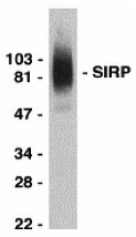 SIRP alpha Antibody: Protein tyrosine phosphatases (PTPases) SHP-1 and SHP-2 are critical regulators in the intracellular signaling pathways that result in cell responses such as mitosis, differentiation, migration, survival, transformation or death. SHP-2 is a signal transducer for several receptor tyrosine kinases and cytokine receptors. A novel SHP-2 associated glycoprotein was recently cloned from human, rat, mouse and cattle by several labs and was designated SIRPalpha, SHPS-1, MyD-1, BIT and p84. SIRPalpha is a new gene family containing at least fifteen members. SIRPalpha is a substrate of many activated tyrosine kinases such as insulin receptor, EGFR, PDGFR and src, and a specific docking protein for SHP-2. SIRPalpha has regulatory effects on cellular responses induced by serum, growth factors, insulin, oncogenes, growth hormones and cell adhesion and plays a general role in different physiological and pathological processes.