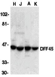 Western blot analysis of DFF45 in HeLa (H), Jurkat (J), A431 (A), and K562 (K) whole cell lysate with DFF45 antibody at 1:1000 dilution.