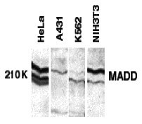 MADD Antibody: MAP kinase-activating death domain protein (MADD) was initially identified as the type 1 tumor necrosis factor receptor (TNFR1) associated protein though their death domains. Overexpression of MADD activates MAP kinases ERK and JNK and induces the phosphorylation of cytosolic phospholipase A2. MADD shares 98% identity with DENN (for differentially expressed in neoplastic vs. normal cells), which was recently identified as a substrate for c-jun N-terminal kinase 3 (JNK3). MADD has greater than 94% overall identity to a GDP/GTP exchange protein Rab3-GEP. MADD is 87% identical to KIAA0358, a brain protein of unknown function. Identification of MADD as a component of the TNFR1 signaling complex and the similarity between MADD and Rab3-GEP provides a connection between TNFR1 activation and downstream MAP kinase activity through a guanine-nucleotide exchange protein.