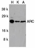 Western blot analysis of ARC in (H) HeLa, (K) K562, and (A) A549 whole cell lysates with ARC antibody at 1 μg/mL.