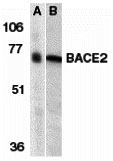BACE2 Antibody: Accumulation of the amyloid-beta (Abeta) plaque in the cerebral cortex is a critical event in the pathogenesis of Alzheimer's disease. Abeta peptide is generated by proteolytic cleavage of the beta-amyloid protein precursor (APP) at beta- and gamma-sites by proteases. The long-sought beta-secretase was recently identified by several groups independently and designated beta-site APP cleaving enzyme (BACE) and aspartyl protease 2 (Asp2). A BACE homolog was recently cloned and designated BACE2, Asp1, DRAP (for Down region aspartic protease), and memapsin 1. BACE2 also cleaves APP at beta-site and at a different site within Abeta. BACE2 locates on chromosome 21q22.3, the so-called ‘Down critical region', suggesting that BACE2 and Abeta may also contribute to the pathogenesis of Down syndrome.