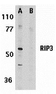 RIP3 Antibody: Certain serine/threonine protein kinases, such as ASK1, RIP, DAP, and ZIP kinases, are mediators of apoptosis. Receptor interacting proteins including RIP and RIP2/RICK mediate apoptosis induced by TNFR1 and Fas, two prototype members in the death receptor family. A novel member in the RIP kinase family was recently identified and designated RIP3. RIP3 contains N-terminal kinase domain but, unlike RIP or RIP2, lacks the C-terminal death or CARD domain. RIP3 binds to RIP and TNFR1, mediates TNFR1 induced apoptosis, and attenuates RIP and TNFR1 induced NF-κB activation. Overexpression of RIP3 induces apoptosis and NF-κB activation. The messenger RNA of RIP3 is expressed in a subset of adult tissues.