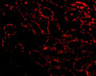 Immunofluorescence of RIP3 in Rat Kidney cells with RIP3 antibody at 20 μg/mL. |