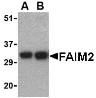 Western blot analysis of FAIM2 in EL4 cell lysate with FAIM2 antibody at (A) 0.5 and (B) 1 μg/mL.
