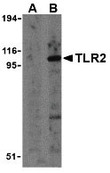 Western blot analysis of TLR2 in A20 cell lysates with TLR2 antibody at 1 μg/mL in the presence (A) and absence (B) of its blocking peptide.