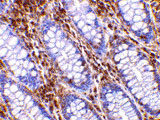 Immunohistochemistry of OMI in human colon tissue with OMI antibody at 10 μg/mL.