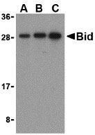 Western blot analysis of Bid in mouse lung cell lysates with Bid antibody at (A) 0.5, (B) 1, and (C) 2 μg/mL.