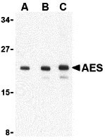 Western blot analysis of AES in 293 cell lysate with AES antibody at (A) 1, (B) 2 and (C) 4 μg/mL.