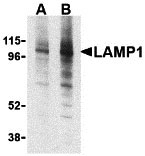 LAMP1; LAMP-1 antibody is predicted to not cross-react with LAMP-2. Due to extensive post-translational modification, LAMP-1 often migrates at higher than predicted molecular weight in SDS-PAGE.