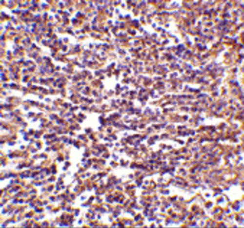 Immunohistochemistry of RP105 in human spleen tissue with RP105 antibody at 2 μg/mL.