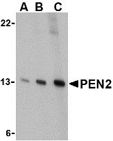 Western blot analysis of PEN2 in K562 cell lysate with PEN2 antibody at (A) 0.5, (B) 1, and (C) 2 μg/mL.