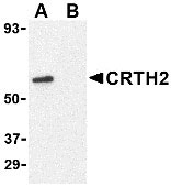 Western blot analysis of CRTH2 in Jurkat cell lysate with CRTH2 antibody at 1 μg/mL in (A) the absence and (B) presence of blocking peptide.