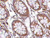 Immunohistochemistry of PTK7 in human colon tissue with PTK7 antibody at 2.5 μg/mL.