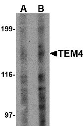 Western blot analysis of TEM4 in Jurkat Cell lysate with TEM4 antibody at (A) 1 and (B) 2 μg/mL.