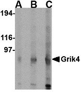 Western blot analysis of Grik4 in rat brain lysate with Grik4 antibody at (A) 0.5 (B) 1 and (C) 2 μg/mL.