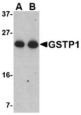 Western blot analysis of GSTP1 in Jurkat cell lysate with GSTP1 antibody at (A) 0.5 and (B) 1 μg/mL.