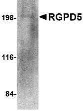 RGPD5 Antibody: The RANBP2-like and GRIP domain containing 5 protein (RGPD5) has high similarity to RANBP2, a large RAN-binding protein localized at the cytoplasmic side of the nuclear pore complex. The gene coding for RGPD5 is thought to have arisen from a gene duplication event of RANBP2 as these highly homologous genes are located close to each other at chromosome 2q11-q12. RGPD5 was identified as an HIV dependency factor (HDF), suggesting that RGPD5 may be an important drug target in HIV treatment. At least two isoforms of RGPD5 are known to exist, of which the shorter isoform is expressed primarily in testis, while the longer of the two is expressed at low levels in a number of somatic tissues.