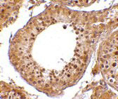 Immunofluorescence of RGPD5 in human testis tissue with RGPD5 antibody at 20 μg/mL. |
