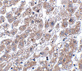 Immunohistochemistry of MATN1 in human liver tissue with MATN1 antibody at 5 μg/mL.