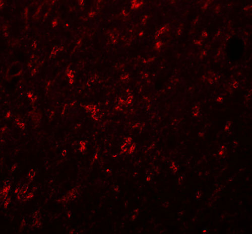 Immunofluorescence of SYNGR4 in rat brain tissue with SYNGR4 antibody at 20 μg/mL. |