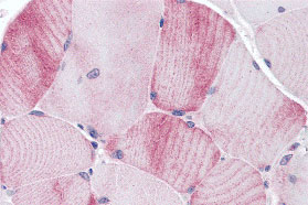 Immunohistochemistry of MYBPC1 in human skeletal muscle tissue with MYBPC1 antibody at 5 μg/mL. |
