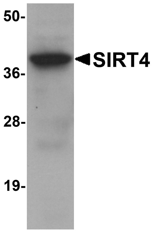 Western blot analysis of SIRT4 in human liver tissue lysate with SIRT4 antibody at 1 μg/mL. |