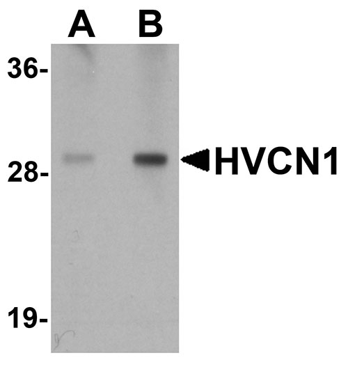 HVCN1 Antibody: HVCN1 (hydrogen voltage-gated channel 1), a voltage gated proton channel protein that is highly expressed in immune tissues, mediates the proton conductances required by phagocytic leukocytes for the oxidative burst that underlies microbial killing. HVCN1 moderates the voltage-dependent proton permeability of excitable membranes by allowing the flow of protons in accordance to their electrochemical gradient. HVCN1 is sensitive to zinc ions, and can be inhibited by them. HVCN1 may represent a new therapeutic target for B cell malignancies on continued signaling via the B cell antigen receptor.