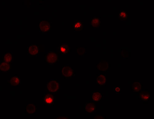 Immunofluorescence of KPNA4 in HeLa cells with KPNA4 antibody at 20 μg/mL. |