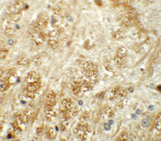 Immunohistochemistry of ATP2C1 in mouse brain tissue with ATP2C1 antibody at 5 μg/mL.