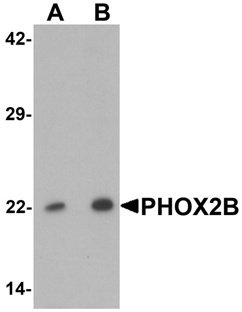 Western blot analysis of PHOX2B in 293 cell lysate with PHOX2B antibody at (A) 1 and (B) 2 μg/mL. |