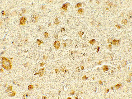 Immunohistochemistry of OLIG1 in human brain tissue with OLIG1 antibody at 5 μg/mL.