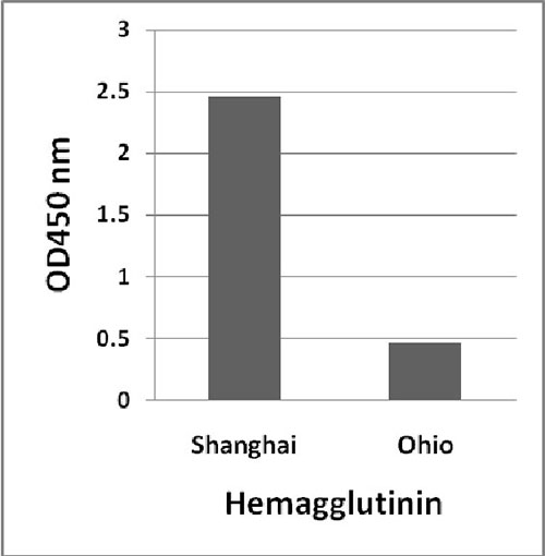 H7N9 Hemagglutinin antibody detects 10 ng of H7N9 [Influenza A virus (A/Shanghai/02/2013(H7N9))] hemagglutinin peptide, and to a lesser extent, 10 ng of H7N9 [Influenza A virus (A/blue-winged teal/Ohio/566/2006(H7N9))] hemagglutinin peptide in ELISA. |