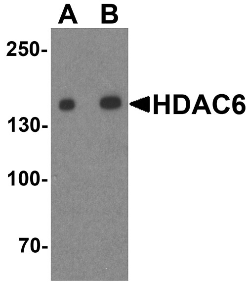 HDAC6; HDAC6 antibody is human and mouse reactive. Multiple isoforms of HDAC6 are known to exist. HDAC6 antibody is predicted to not cross-react with other members of the HDAC family.