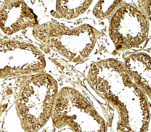 Immunohistochemistry of HDAC6 in human testis tissue with HDAC6 antibody at 5 μg/ml.