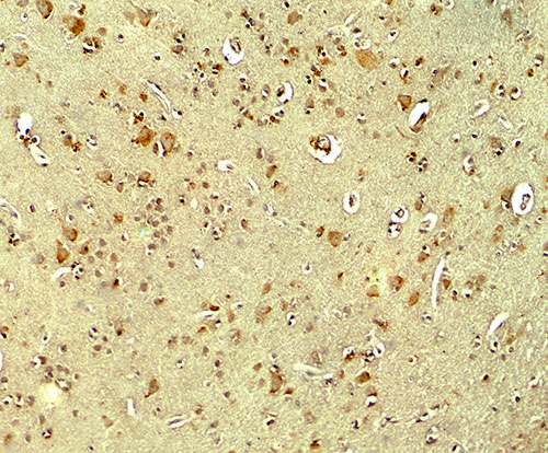 Immunofluorescence of PARK2 in human brain tissue with PARK2 antibody at 20 μg/ml. |