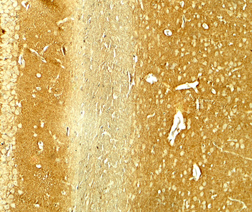 Immunohistochemistry of SNCA in rat brain tissue with SNCA antibody at 5 μg/ml.
