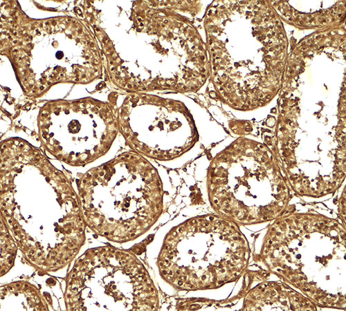 Immunohistochemistry of AKAP4 in human testis tissue with AKAP4 antibody at 5 μg/ml.