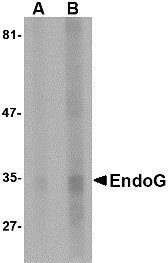 Western blot analysis of EndoG expression in HepG2 cell lysate with EndoG antibody at (A) 5 and (B) 10 μg/mL. |