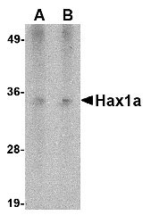 Western blot analysis of Hax1a in human heart tissue lysate with Hax1a antibody at (A) 1 and (B) 2 μg/mL. |