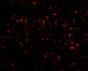 Immunofluorescence of ORAI1 in Human Spleen tissue with ORAI1 antibody at 20 ug/mL. |