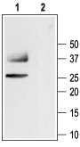 Western blot analysis of rat kidney membranes: 1. Anti-Aquaporin 1 antibody (APG01971G), (1:400). 2. Anti-Aquaporin 1 antibody, preincubated with the control peptide antigen .